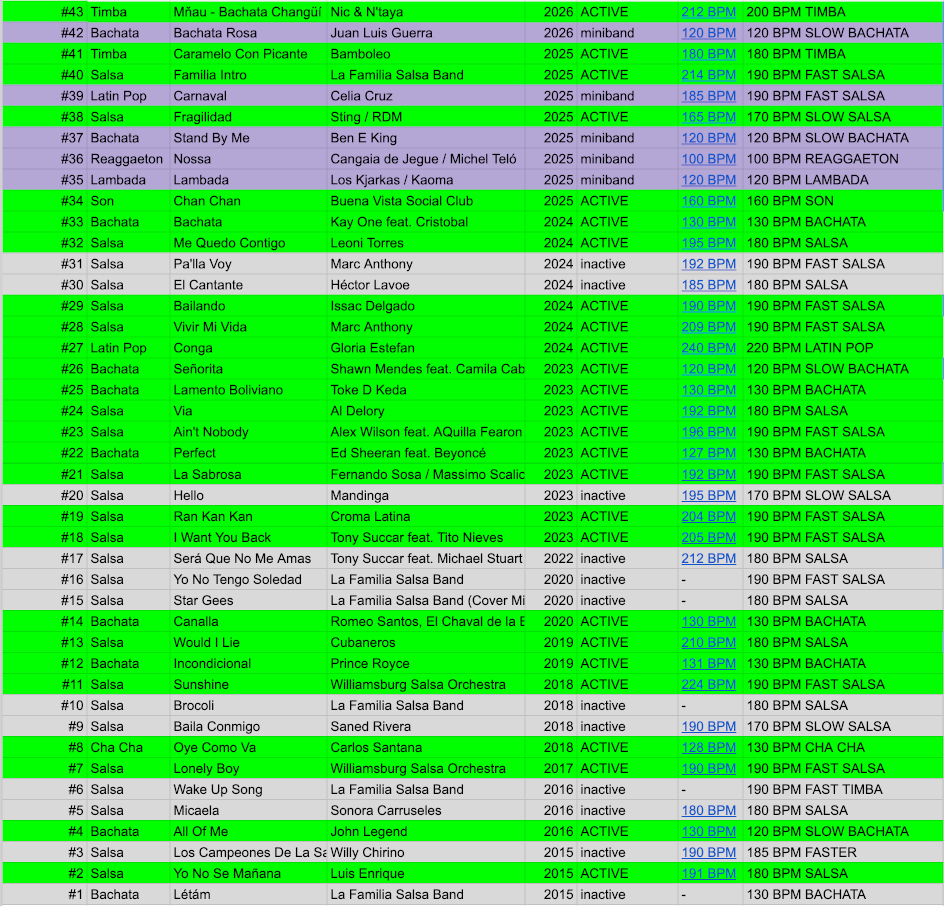 26 ACTIVE | TIMBA: 2, SALSA: 14, BACHATA: 7, CHACHA: 1, SON: 1, LATIN POP: 1 | 5 MINIBAND